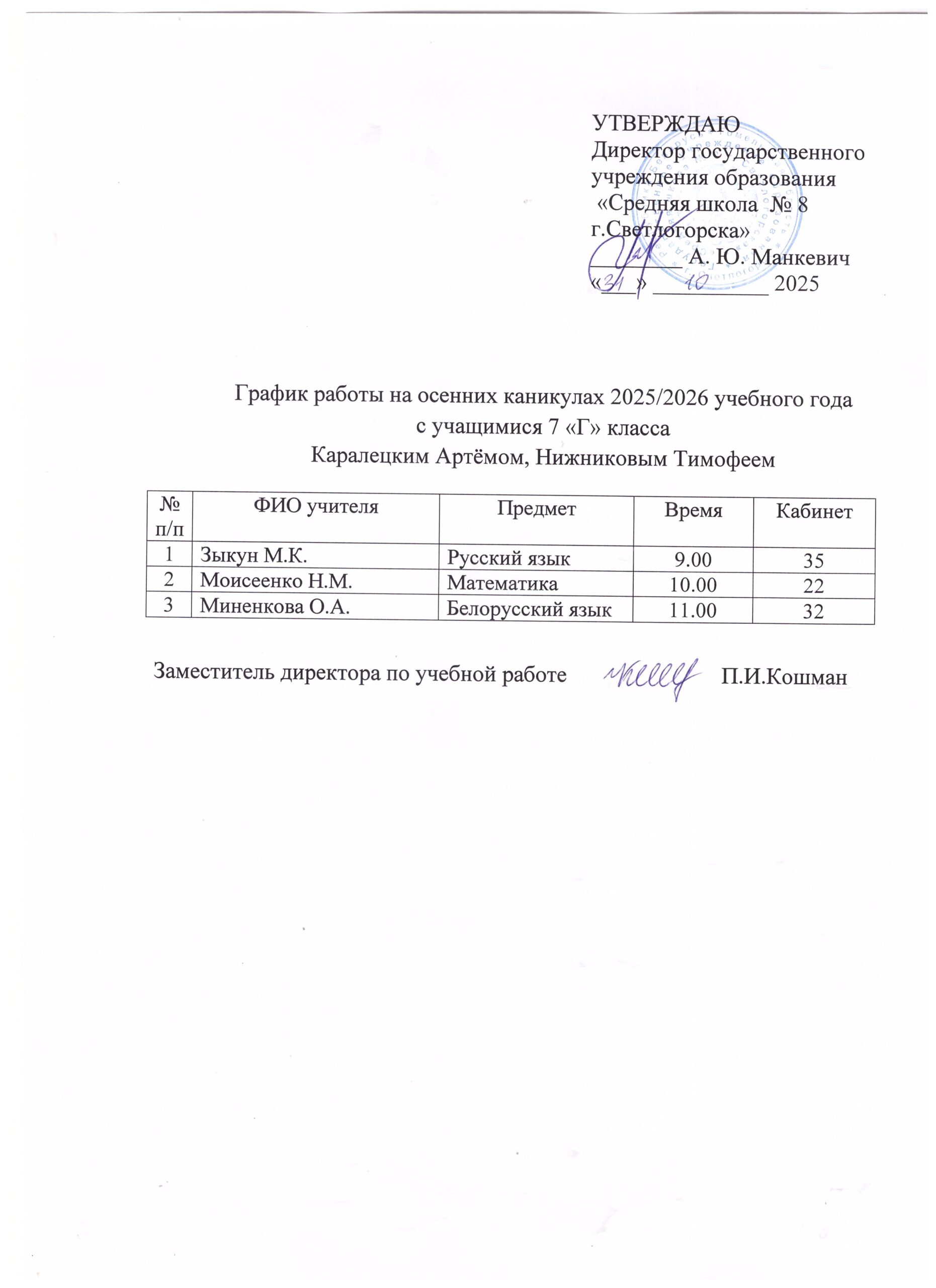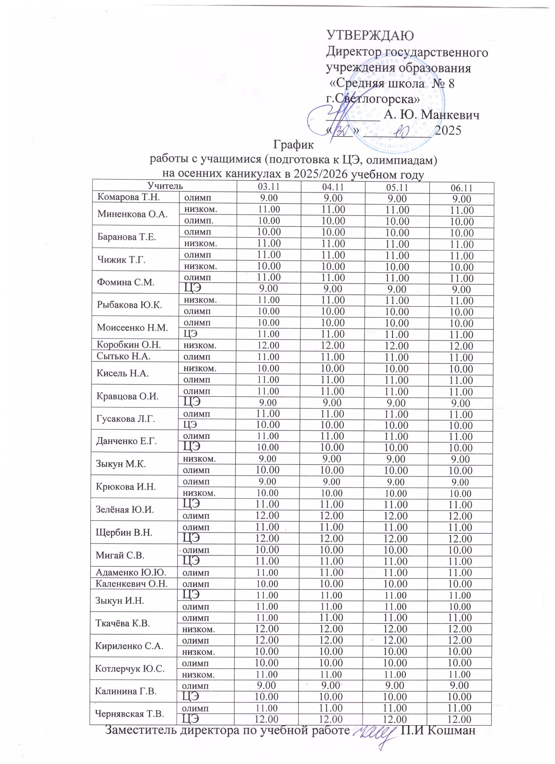 Графики работы на осенних каникулах